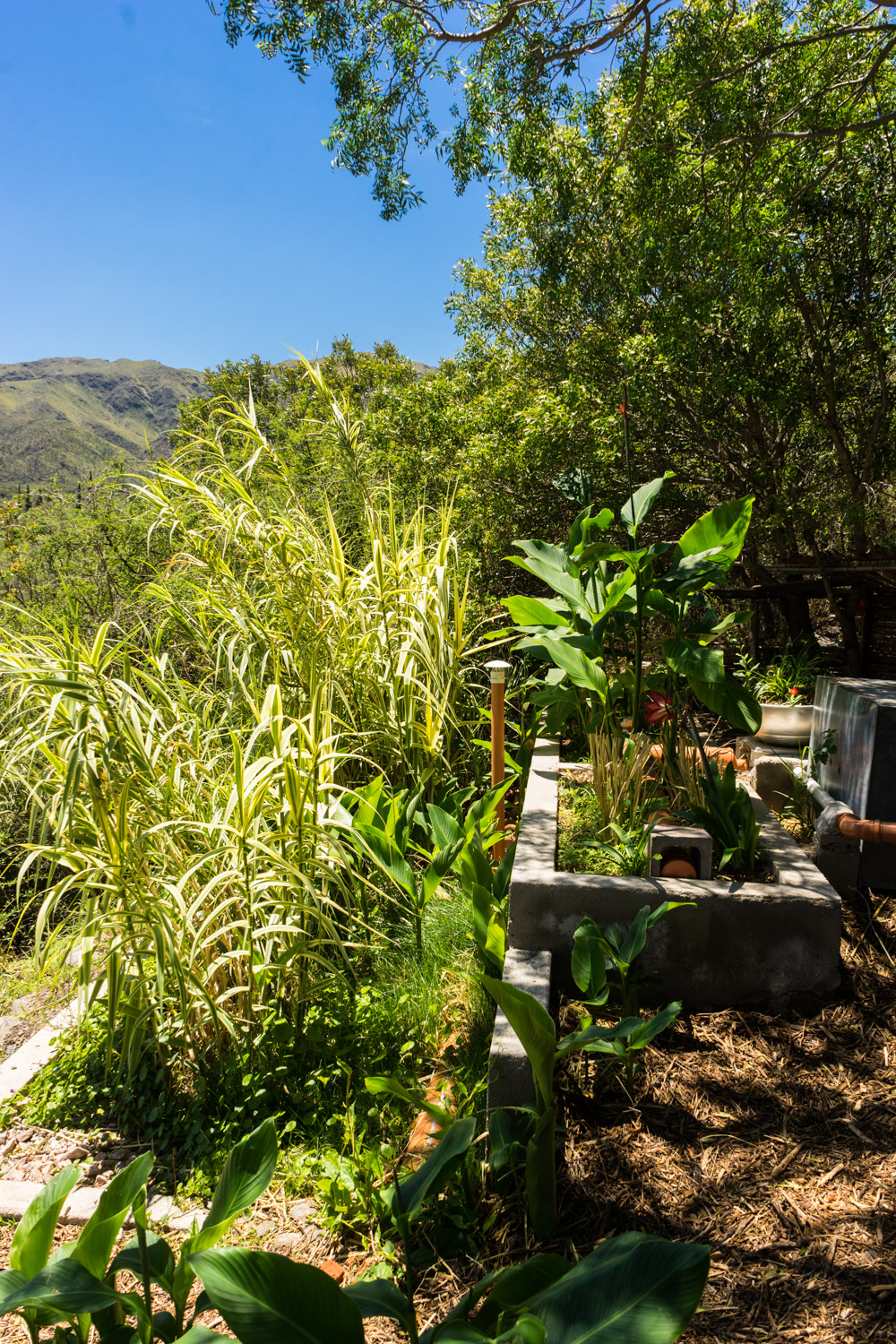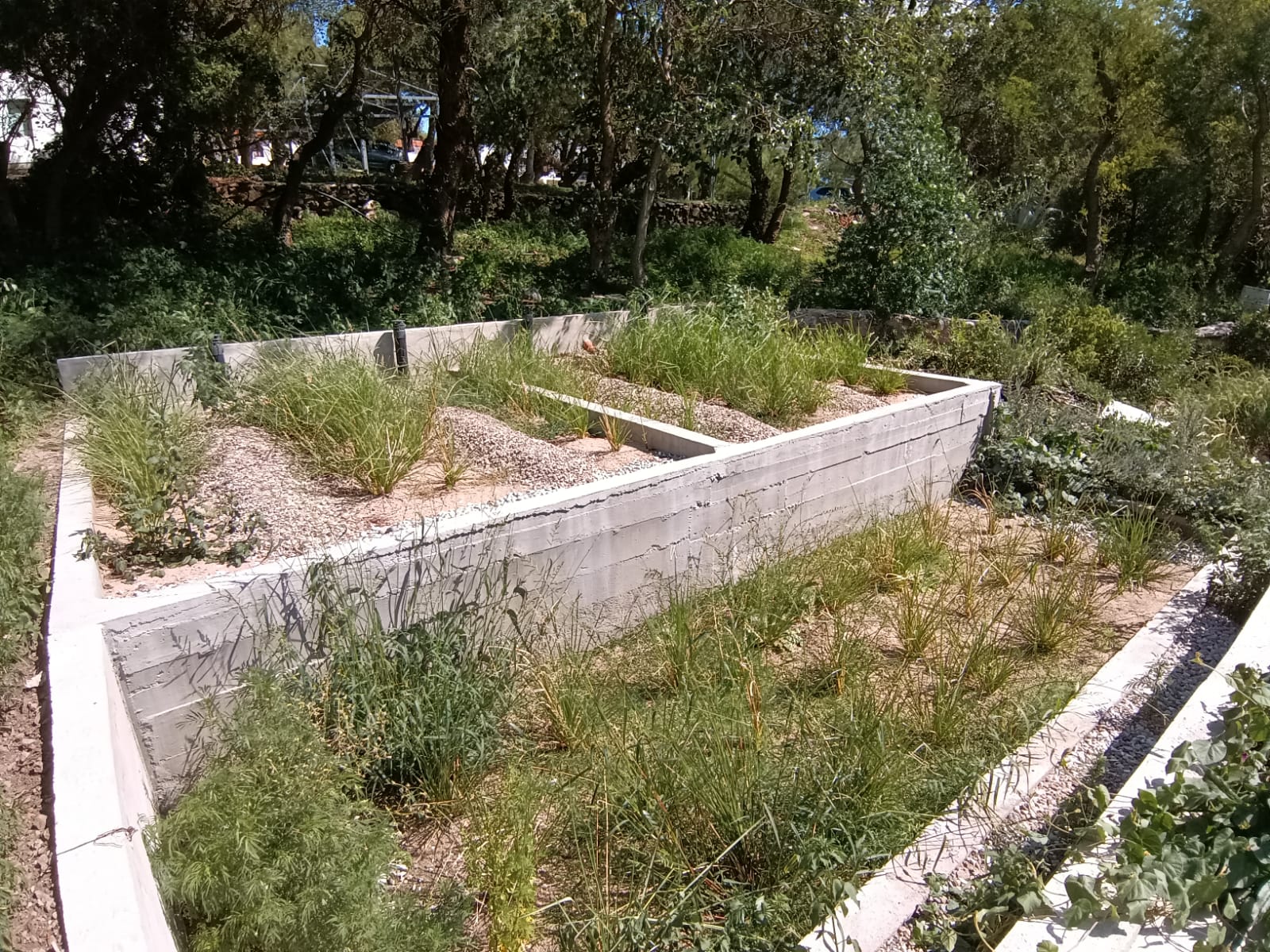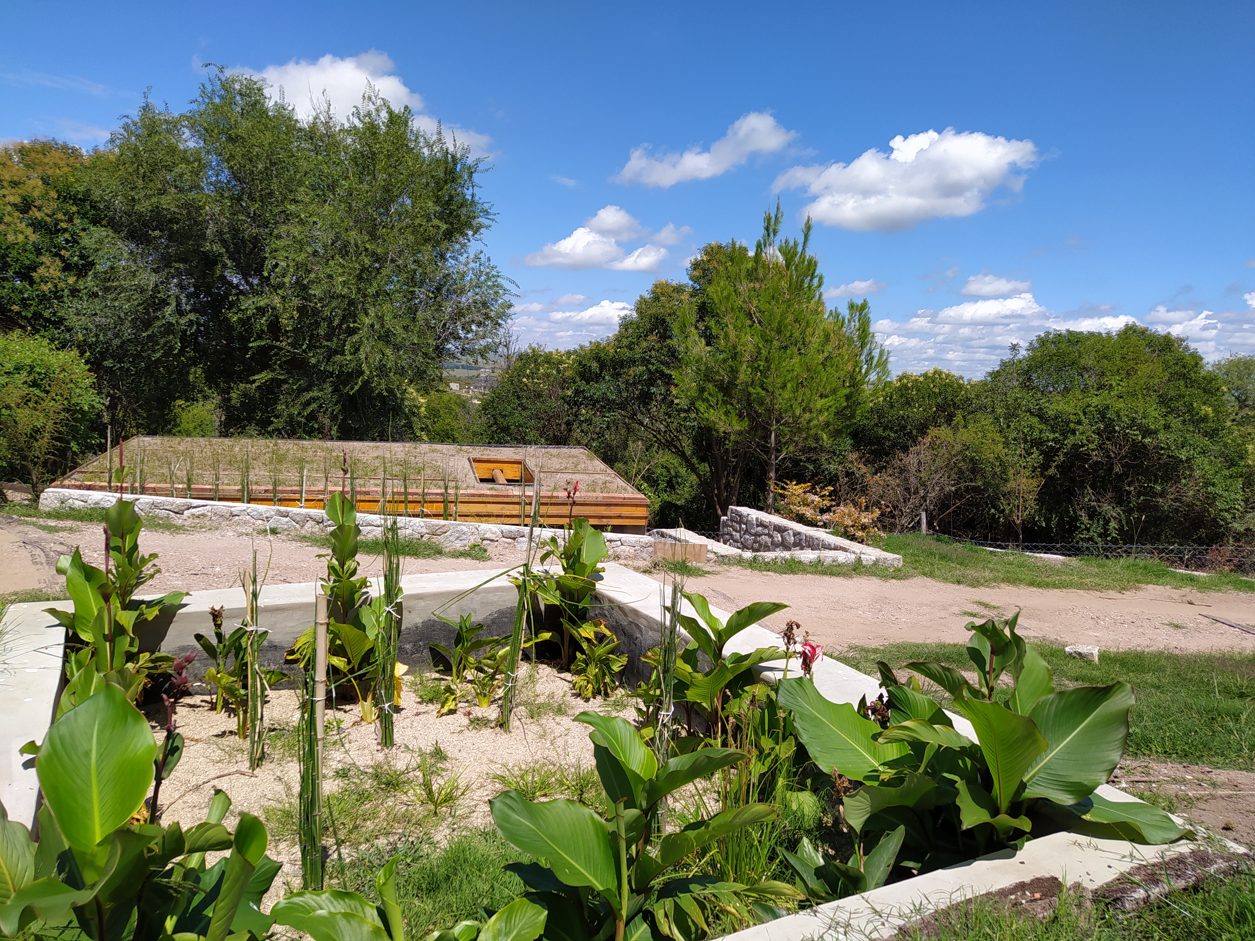 Tratamiento para 60 personas, separando aguas grises y aguas negras. Las aguas grises tratadas son reutilizadas para riego.